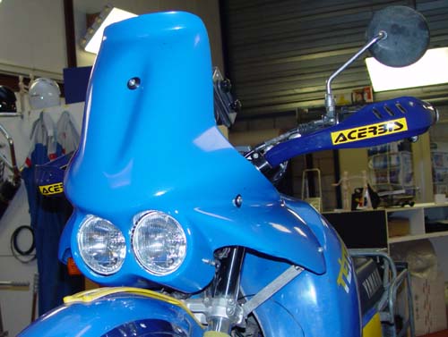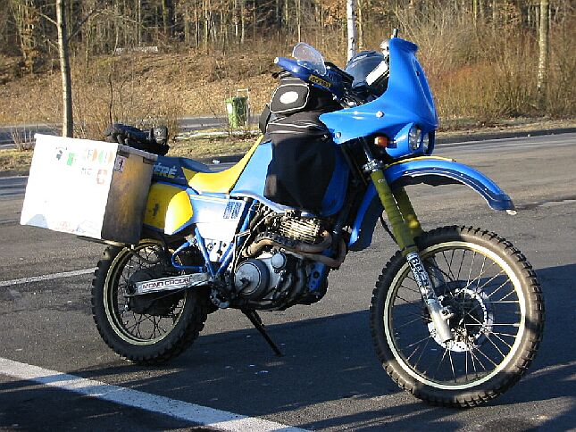 Da ich für Geländespiele jetzt ein passendes Gerät habe, habe ich die Tenere für die große Tour fertig gemacht. Dazu habe ich Alukoffern samt Pistenträger, Ölkühler, einen 36 Liter Tank und Ende 2002 ein neues Cockpit angebaut. Dadurch ist sie für größere Touren (auch zu zweit) ideal geeignet, bei denen auch mal Pisten befahren werden können. 2002 haben wir eine größere Frankreichtour unternommen wo die Maschine ihre Qualitäten bewiesen hat.